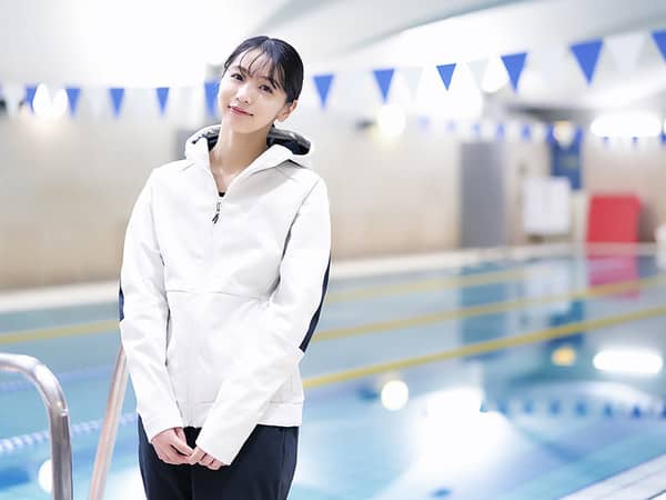 トップス:テックシールドジャケット/パンツ:テックシールドパンツ/水着:エクサースーツミディアムカット、アクアフィットネス用セパレーツ(ミズノ)
