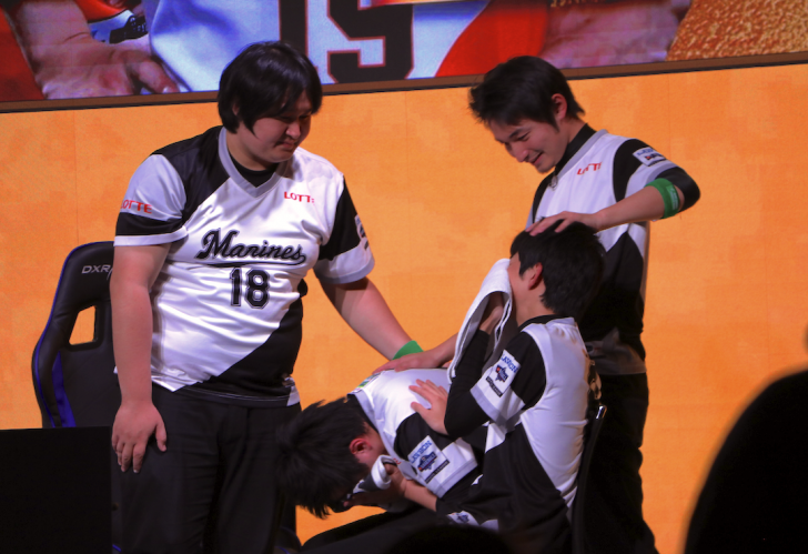 勝利を手にしたのは、2ゲームを制した巨人。勝利の瞬間、ステージ上には代表4選手から安堵の笑顔がこぼれた。eペナントレースを苦しみもがき終えた激戦の様子が手に取るようにわかる表情だ。