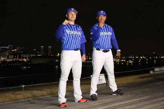 新ユニホームを身に着けたDeNA・ラミレス監督(右)、佐野恵太【写真:編集部】