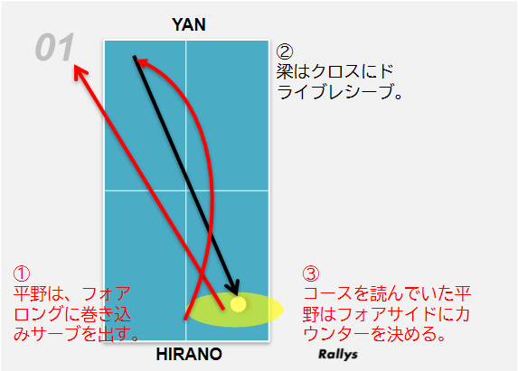 上の図は、第1ゲーム7-5で平野リードの場面。この場面では、平野が巻き込みのロングサーブを梁のフォアミドルに出した。ここで梁は、強烈なドライブレシーブで攻めていき、得点を奪ったかのように思われた。