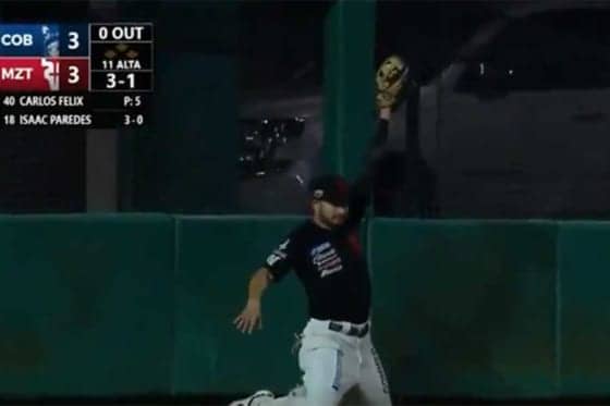 フェンスに右足を引っかけてジャンプ、両膝をつけてグラブを高々と掲げた メキシコのウインターリーグでまるでスパイダーマンの…