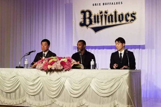 入団会見に臨んだオリックスの新助っ人アダム・ジョーンズ(中央)【写真:編集部】