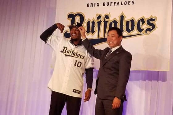 26日に入団会見に臨んだオリックスの新助っ人アダム・ジョーンズ(左)【写真:編集部】
