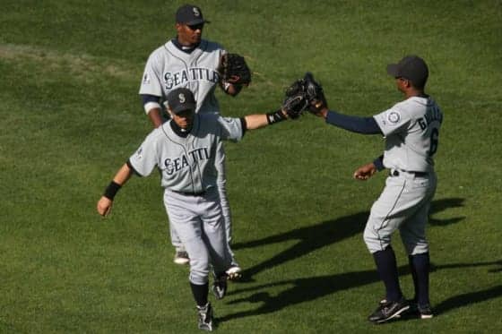 かつてマリナーズで右中間を組んだアダム・ジョーンズ(左奥)とイチロー氏(左前)【写真:Getty Images】