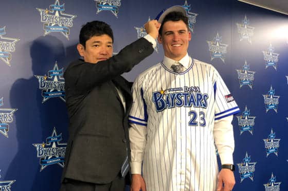 入団会見を行ったDeNAのタイラー・オースティン(右)【写真:編集部】