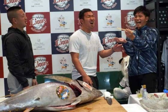 ドラ1宮川は2位・浜屋、5位・柘植らと60キロの大物マグロに自ら包丁、刺し身にして舌鼓を打った 西武のドラフト1位、宮川…