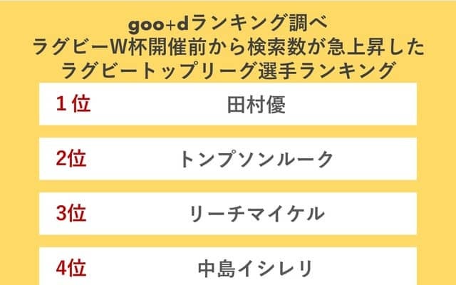 goo+dランキング(グッドランキング)は、gooとNTTドコモが運営するdメニューの検索ログから、ラグビーワールドカッ…