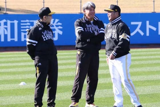 今季から会長付き特別アドバイザーに就任した城島健司氏も初日から参加。15年ぶりにホークスのジャージに身を包んだ城島氏は練習開始前には王貞治球団会長、工藤公康監督と3人で談笑し豪華なスリーショットも実現。選手やスタッフ全員の前でも挨拶し「昔ホークスで野球をやっていた城島です。専門分野は魚釣りと麻雀です。聞きたいことがあれば、何でも聞きにきてください」と自己紹介した。