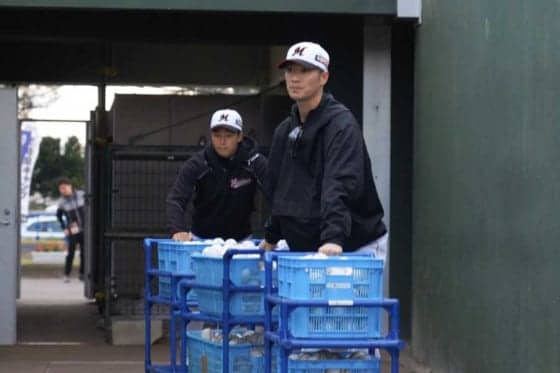 【画像】まるで外野の守備練習のよう? ロッテの帽子がよく似合う練習補助員・西岡がボール拾いをする実際の画像
