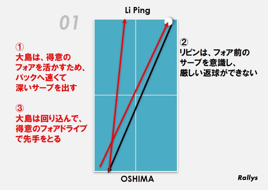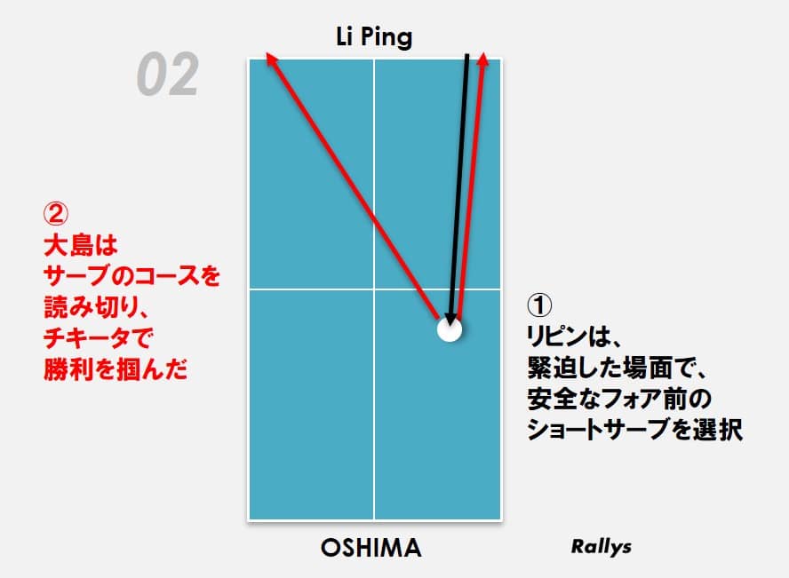 しかし、バックロングに対し回り込まれ、フォアで攻撃されると得点するのは難しい。そこで大島は、ショートサーブを遠いフォアサイドへコントロールすることで、バックロングをリピンに回り込ませないような配球を見せた。この組み立てにより、大島は自身のサーブから確実に先手を取ることができ、得意のフォアドライブ連打に繋げたのである。