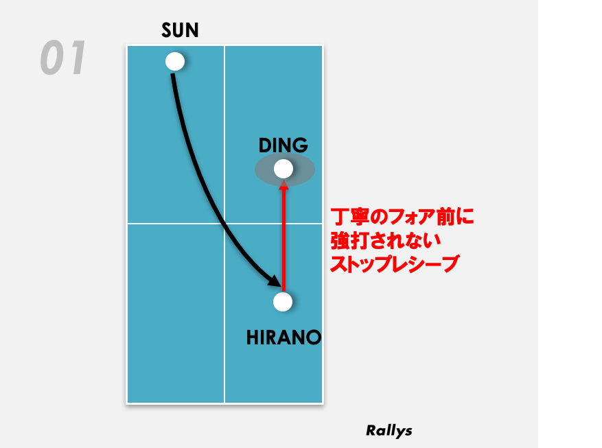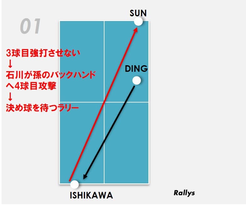 まず孫穎莎のサーブを平野がサウスポーの丁寧の身体から最も離れたフォア前に落とし丁寧を台の中まで出させる。丁寧はフリックやツッツキで3球目を対応するが、平野の質の高いストップにより決定的な攻撃にはならない。それを石川が孫穎莎のバックに回転量のあるボールで返す。