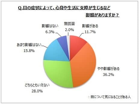 マイボイスコム株式会社の『目の健康』に関するインターネット調査によると、目の症状で気になることとして「目が疲れやすい」を挙げた人は全体の51.0%。また、目の症状によって心身や生活に影響がある人と答えた人は5割弱という結果に。