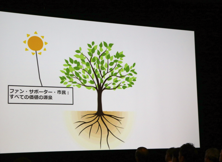 ユニークな木のイラストをモチーフとしたプレゼンテーション資料を展開し、Jリーグ・村井満チェアマンは背筋を伸ばしマイクを持つ。