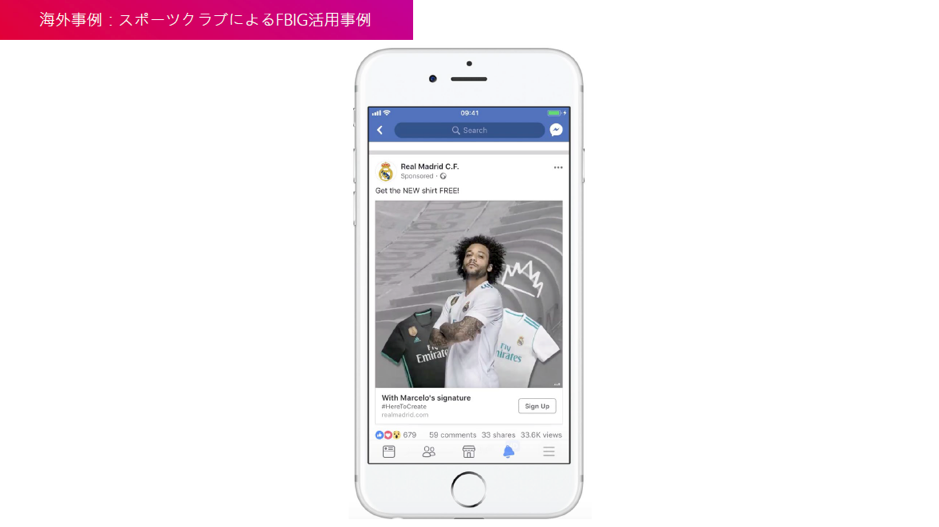 サッカーチームでいうと、レアル・マドリードも効果的に活用していますね。オーガニックの投稿だけでなく、彼らはちゃんと広告も活用しているんです。これはFacebook広告ですが、ビジュアルにも動きをつけてモバイルに合わせたクリエイティブを作っています。
