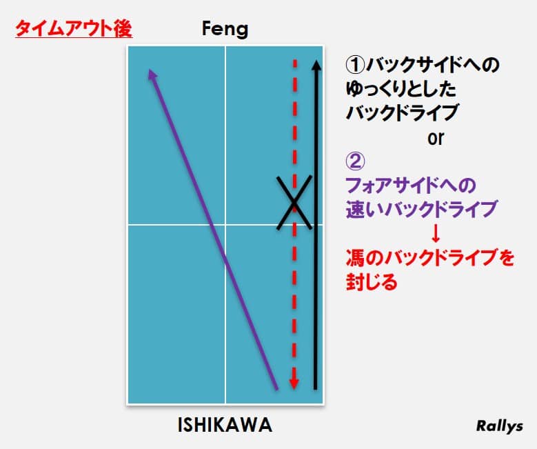 この両サイドへの緩急のついたボールにより、石川は馮の得点源であるバックドライブを封じ、逆に自らの得点パターンを作り出すことに成功した。