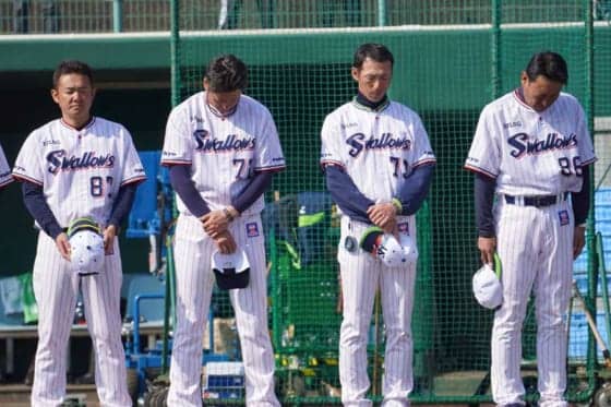 ヤクルト2軍の宮崎・西都キャンプで11日、元監督の野村克也氏の死去をうけ、西都原運動公園野球場のスコアボードの上に半旗が掲げられ、午後1時30分から1分間の黙祷が捧げられた。池山隆寛2軍監督ら首脳陣、ドラフト1位ルーキー奥川恭伸投手ら選手、スタッフがこうべを垂れた。