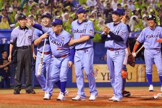 2019年のヤクルトOB戦に出場した当時の野村克也さん(左から3人目)【写真:荒川祐史】