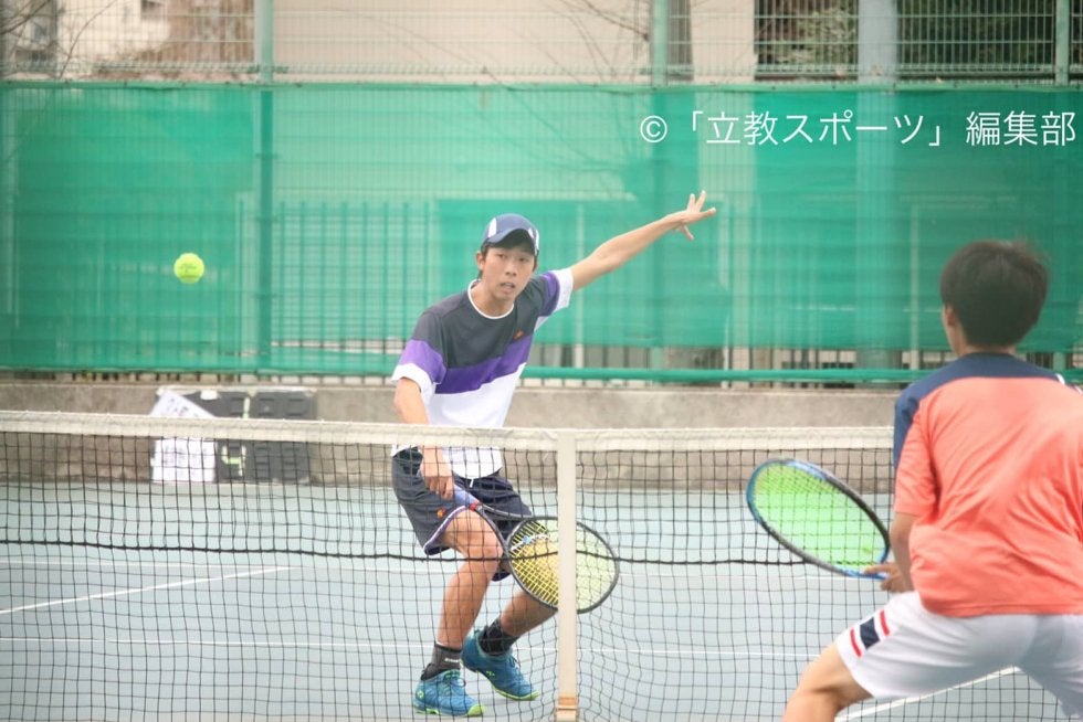 強烈なサーブを武器とする保坂と、繊細なボレーのタッチを見せる在原は、それぞれの強みを活かし強敵相手に全く引けを取らない接戦を繰り広げた。しかし、要所要所でファーストサーブの確率が低下し、サービスゲームをキープできない場面が見られた。結果0−2(4−6、4−6)で保坂・在原ペアは惜敗。これからの課題が明確になる試合となった。