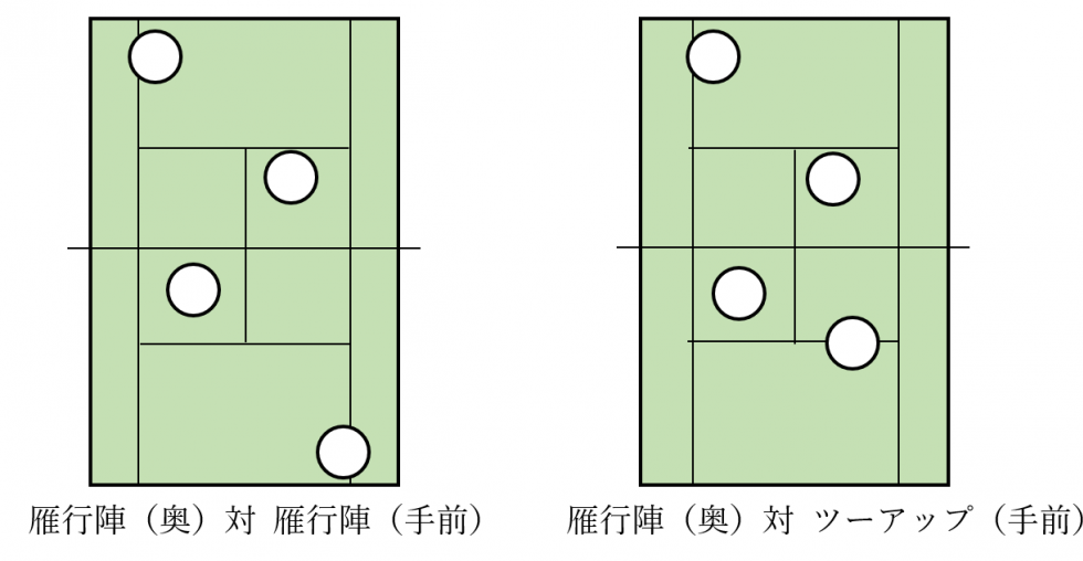 ※ツーアップとは、通常の陣形(=雁行陣(がんこうじん))の状態から、後衛が前に出て2人ともボレーで攻める陣形のこと