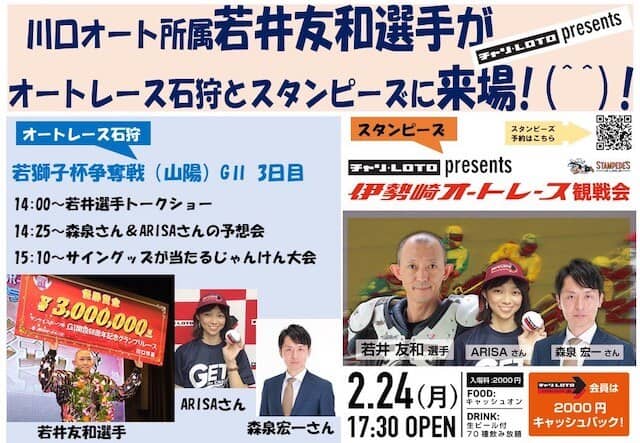 『チャリ・ロトプレゼンツ/伊勢崎オート観戦会』を若井選手と一緒に楽しめるイベントです。
