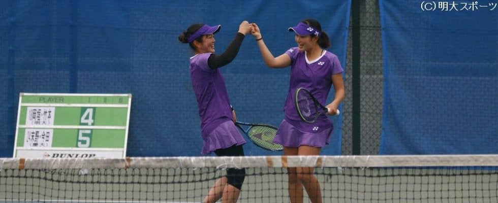 入学後は継続してペアを組んでいる2人。1年間を振り返り「以前よりダブルスの動きができるようになってきた」と手応えがある。今大会で上がった課題を次戦に生かしたい。試合後は「決勝で先輩(吉田百・金山組)と戦うことが目標だったので悔しい」と声をそろえた。ベスト8はまだまだ満足できない。来年度のさらなる活躍が楽しみだ。