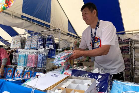 北谷球場のグッズ売り場で商品を薦める北野勝則さん【写真:小西亮】