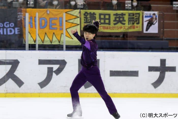今シーズンのSP(ショートプログラム)である『tonight』に合わせ、唯一無二の表現で会場を沸かせた鎌田英嗣(営4=獨協)。トリプルアクセルをミスし、手を合わせる場面も見られたが最後の滑りにふさわしい美しい演技を見せた。