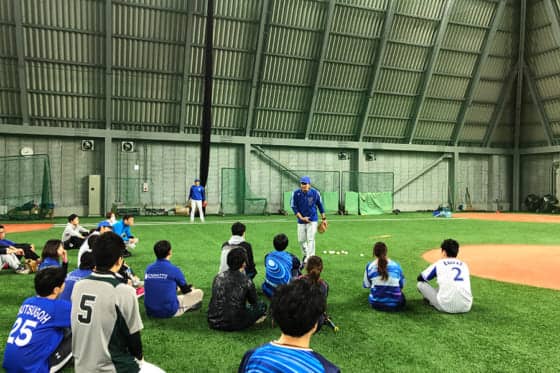 1週間の仕事を終えた後、金曜日の夜7時半。昨夏に完成したばかりの「DOCK OF BAYSTARS YOKOSUKA」屋内練習場に、27人の大人が集まった。普段はDeNAの選手が練習で利用する屋内練習場が、一般に解放される稀なチャンス。球団OBの秦裕二氏(2002年入団)と赤堀大智氏(2013年入団)、そして30年以上にわたり球団でコンディショニングを担当してきた塚原賢治氏を講師に迎え、待ちに待った「夜間練習」がスタートした。