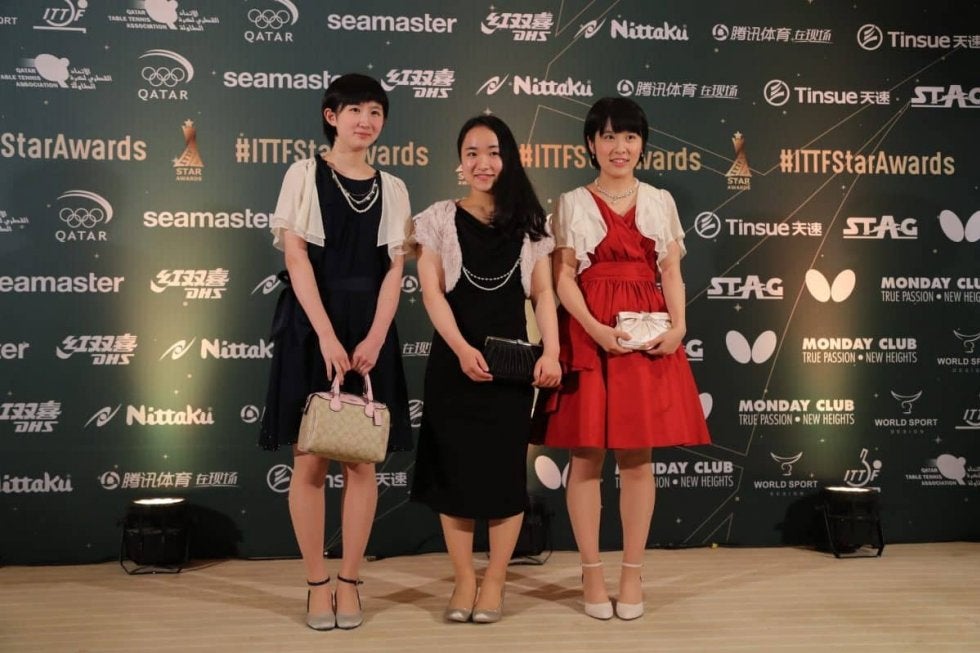 写真:左から早田ひな・伊藤美誠・平野美宇(2016 ITTFスターアワード)/撮影:ITTF・アフロ
