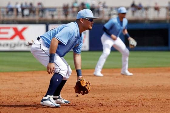 「5番・三塁」で出場した筒香は“変形シフト”を敷いた際に遊撃の位置で守ったツインズ 10-8 レイズ(オープン戦・日本時…