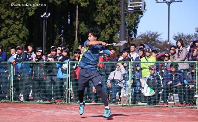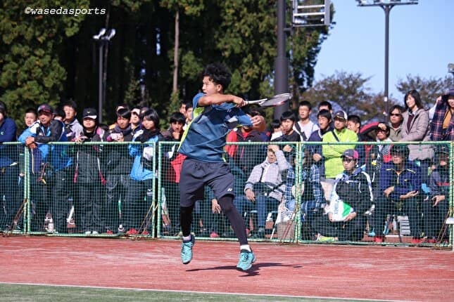 そして迎えた最後のインカレ。上松俊貴(スポ3=岡山理大付)ら主力選手が出られないという厳しい状況だった。それでも「1年間やってきたことをぶつけてあきらめずやろう」という意気込みでチーム一丸となって臨んだ。結果はどの学年も奮起し、見事インカレ奪還。優勝を決めたあとは「やっと解き放たれる」という安堵があったという。さらに早大の快進撃は止まらなかった。ダブルスの個人戦では長尾景陽(社=岡山理大付)・松本倫旺(スポ=熊本・済々黌)組が優勝。インカレ3冠がありうるという状況になった。「自分もやらないといけない」という気持ちで内本はシングルスの個人戦に臨んだ。多くの選手が残って応援してくれたこともあり、内本は「いいチームだな」と思ったという。結果は見事優勝。1年間の努力が実を結んだ瞬間だった。