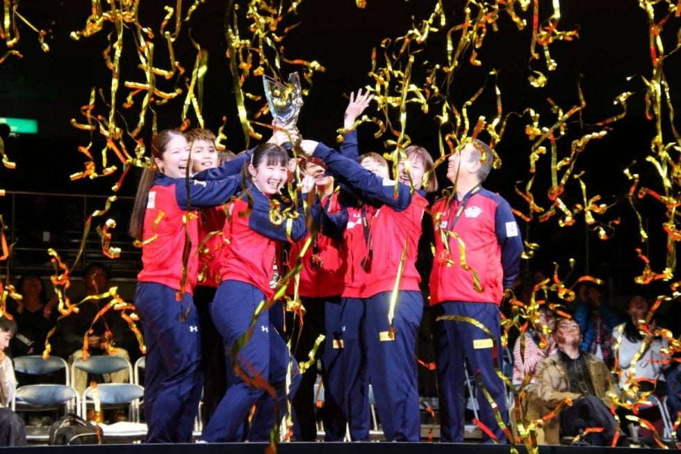 写真:優勝トロフィーを掲げる日本生命レッドエルフメンバー/撮影:ラリーズ編集部