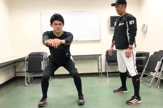 スクワットをするロッテ・佐々木朗希【写真提供:千葉ロッテマリーンズ】