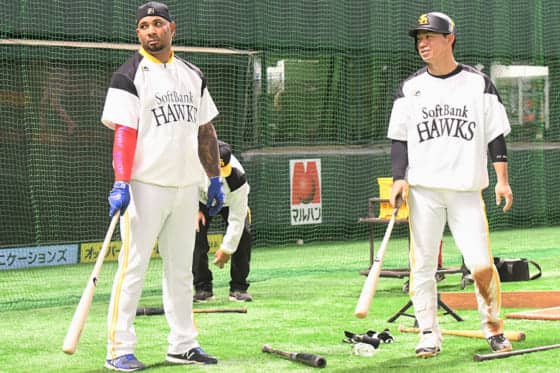 ソフトバンクのウラディミール・バレンティン(左)と長谷川勇也【写真:藤浦一都】