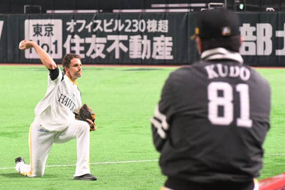 デニス・サファテ投手が17日、PayPayドームで行われた先発投手練習に参加。相変わらずアップ時には1人でしゃべり続けるなど、明るく充実した表情で汗を流した。