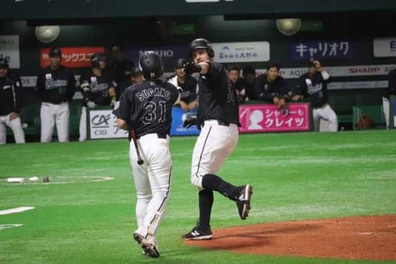 2回にはソフトバンクの松田宣浩内野手がソロ本塁打を放ち「熱男」パフォーマンスを決めたばかり。レアードもダイヤモンドを一周し仲間とハイタッチを繰り返すと、ベンチ前で「釣り」からの「寿司」パフォーマンスを披露。三木が不在のため、握った寿司を食べたのは新加入の福田秀だった。(福谷佑介 / Yusuke Fukutani)