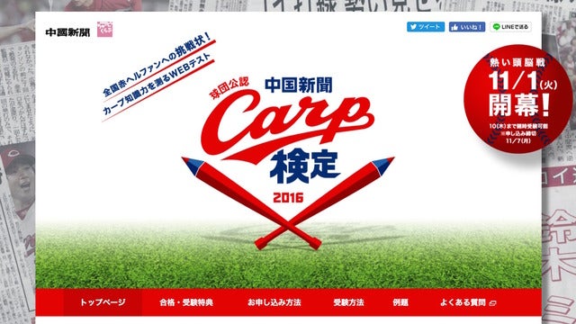 中国新聞は、広島東洋カープに関する知識力を測るウェブテスト「球団公認・中国新聞カープ検定2016」を11月1日(火)より…