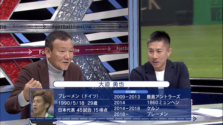 前半戦では、中盤まで降りて攻撃を組み立てるシーンが多かった大迫。スペシャルゲストの川勝良一は、「リバプールはスペースを消されると、フィルミーノが降りてくるが、それを許されるのは絶対的に上手い選手」と世界的なストライカーに役割を例えた。その上で「大迫が起用できないのはチームの事情もあるし、コンディションの問題もある」と現状について語っている。
