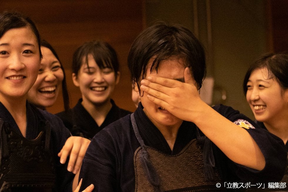 決勝後、創部史上初の大快挙に笑顔を見せる部員たちの輪。その中心には、うれし涙で顔をぬらす松原がいた。ひとしきり泣いた後には、はじける笑顔で喜びをあらわにする。「みんなのおかげで剣道が大好きです」。