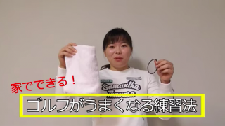 使用するのはタオルとゴムのみでタオルの先端にゴムを巻き、クラブと同じように振るという練習方法。コツは、タイミング良くしっかり振ることで、良いスイングの時は良い音が出るようだ。