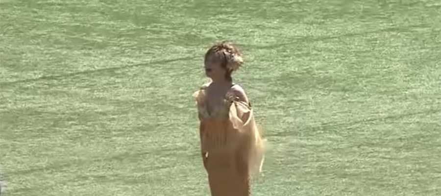 勝利の女神をイメージしたゴールドドレス、そして真っ白な羽が装着されたブルペンカーに乗って登場した“ラスボス”はマウンドに到着するとバズーカー砲を手にした。捕手役の里崎智也氏、打者の江村を吹き飛ばす999キロ? の剛速球を披露し大歓声を浴びた。