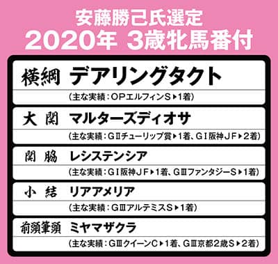 そこで今年も、競走馬の分析に長(た)けた元ジョッキーの安藤勝己氏を直撃。牝馬クラシックに挑む面々の実力について診断・分析をしてもらい、独自の視点による「3歳牝馬番付」を選定してもらった--。