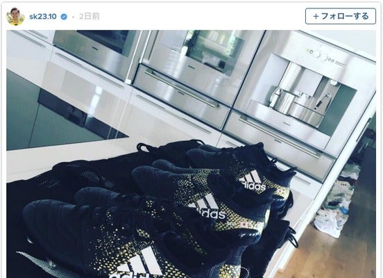 日の丸マークが入ったアディダスの黒のスパイクを並べた写真を掲載。現在、所属チームでも日本代表でも苦戦を強いられているが、真新しいスパイクで気分を一新し、復調のきっかけとなるか期待がかかる。