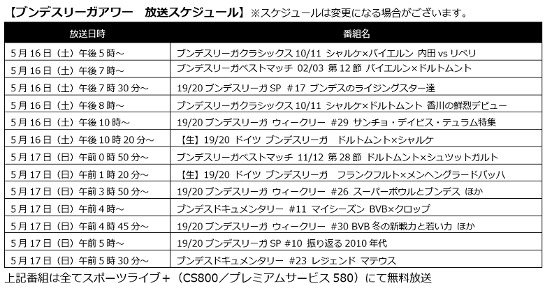 この中には、再開節以降に行われる全9試合のうち、日本時間16日(土)午後10時20分よりスポーツライブ+にて放送のドルトムントvsシャルケのレビア・ダービーや、17日(月)午前1時20分よりのフランクフルト対メンヘングラードバッハの生中継をはじめ、ブンデスリーガ関連番組が無料放送される。かつて香川真司が自身のレビア・ダービーのデビュー戦で2ゴールを挙げた試合や、シャルケに所属していた内田篤人がバイエルンのリベリーと激しいマッチアップを繰り広げた試合など、かつてのファンも楽しめる充実のラインナップとなっている。