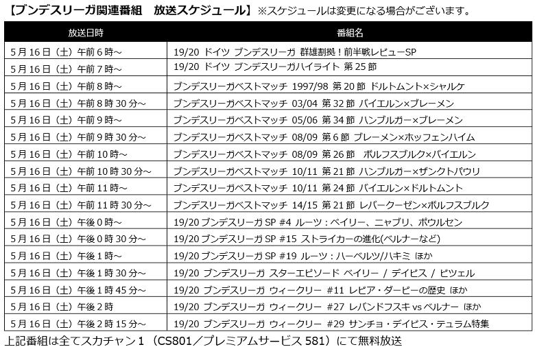 19/20ドイツ ブンデスリーガ再開の報を受け、スカパー!のスポーツライブ+では日本時間5月16日(土)開催の試合からライブ中継を再開する。同日午後5時から翌17日(月)午前6時までの13時間を、『ブンデスリーガアワー』として、ブンデスリーガの厳選された番組を一挙放送!
