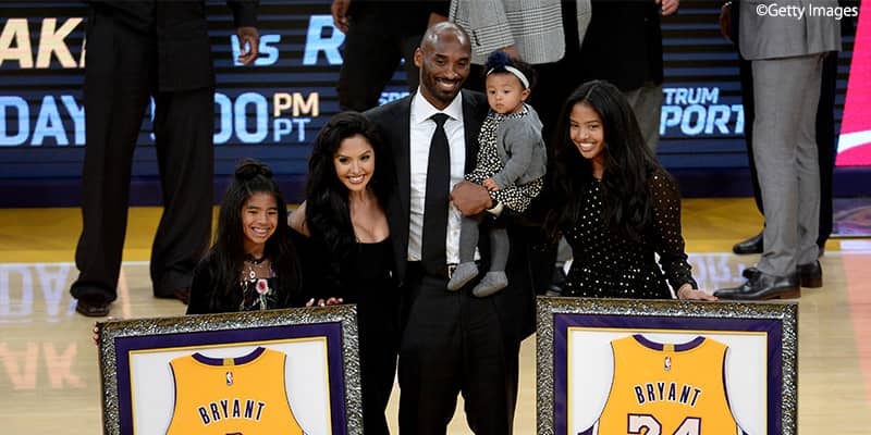 2017年12月にステイプルズ・センターで行われたコービ・ブライアントの永久欠番セレモニーには家族で参加した[写真]=Getty Images