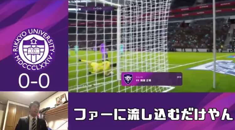 試合はその後、両チームともに決定機を生かせず0−0で終了。立大は勝ち点1を獲得したが、GL最終節・対東大戦を残し1位突破の可能性が消滅したため、SNSに投稿される動画の「いいね」数で敗者復活枠を狙う。