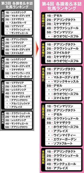※『Sportivaオリジナル番付』とは、デイリー馬三郎の吉田順一記者、日刊スポーツの木南友輔記者、独特なデータを駆使するパソコン競馬ライターの市丸博司氏、フリーライターの土屋真光氏、Sportiva編集部競馬班の5者それぞれが、今回はオークスに出走予定の3歳牝馬の実力・能力を分析しランク付け。さらに、そのランキングの1位を5点、2位を4点、3位を3点、4位を2点、5位を1点として、総合ポイントを集計したもの。