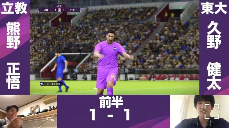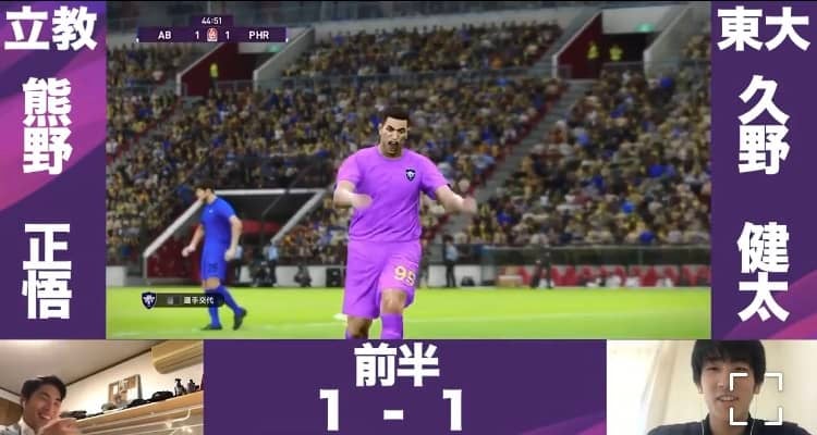 グループリーグB第3節の試合動画が18日に配信された。ここまで1分1敗の立大は東大(2勝)と対戦。試合開始早々に失点を許すも、前半終了間際に熊瀬(営3=FC町田ゼルビアY)がボレーシュートを決め、1−1で引き分けた。立大は前節終了時点で1位通過の可能性が消滅していたが、スタメン動画とハイライト動画の「いいね」とリツイートの数で他大を上回り、敗者復活枠で決勝トーナメント進出を果たした。準決勝は早大(グループA1位)と対戦し、試合の動画は22日(金)に公開される。
