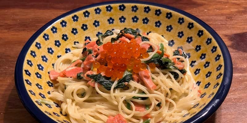 ④茹で上がったスパゲッティを入れて軽く混ぜ、お皿に盛りつけてから、いくらを乗せる。